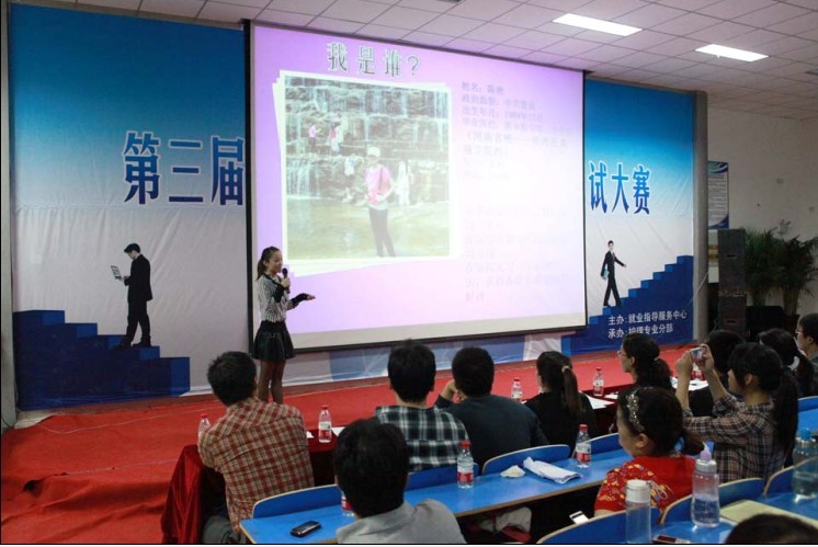 在第一环节,选手通过PPT展示及即兴演讲来展现个人风采,他们对各自简历的创意之处做了详细阐释,力求突出“简约而不简单”的特点。其中3号选手杨帆,5号选手李慎谟,11号选手贾亚楠沉稳大气,条理清晰的演讲赢得台下阵阵掌声。7号选手杜佳别具匠心,自己改编歌曲《独家记忆》的歌词,将自己的名字巧妙融入其中,用视频歌曲完成了个人简介。在中间休息环节,幽默风趣的相声缓解现场紧张气氛,博得满堂彩。经过比拼,有10名选手进入职场面面观。此环节主要考验选手的临场应变能力及职场处事方式,晋级选手从准备好的ppt中挑选题目并经过20秒的思考后作答。题目涉及职场中面临的棘手问题,选手们临危不惧,做出精彩的回答。