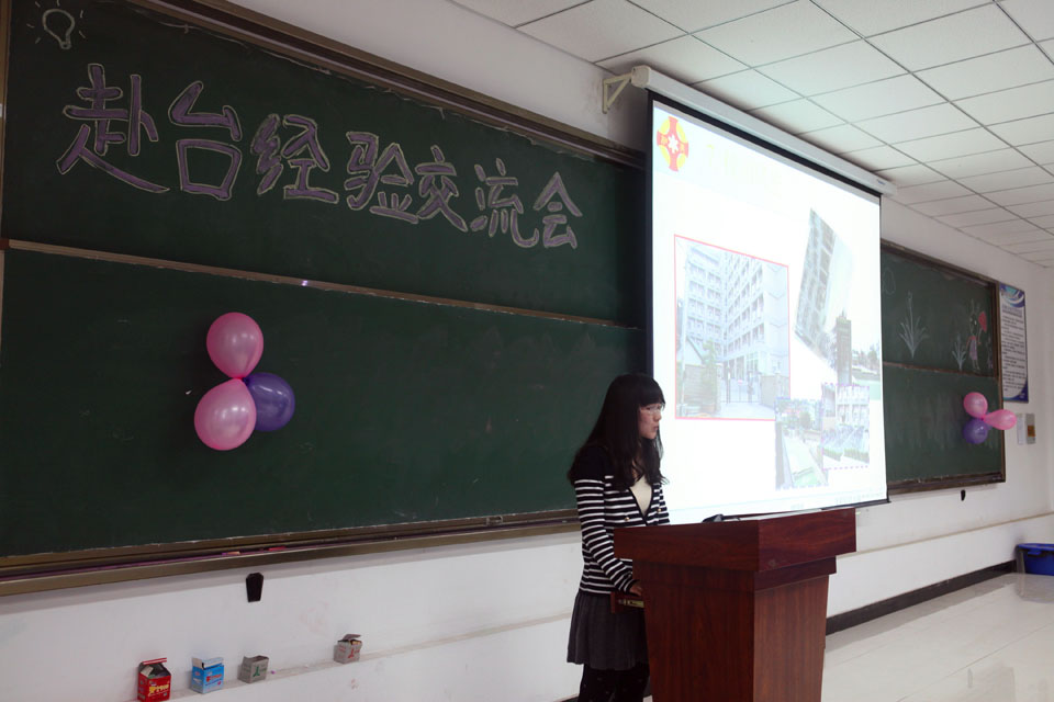 接下来,我院2012年赴台学习的张迎迎同学进行个人学习体会的交流。张颖颖于2012年9月获得台湾美和科技大学的录取通知书并赴该校进行了为期三个月的学习。她向大家汇报了在台学习、生活期间的所见、所闻和所获。她把在台湾看到的美丽的校园风景,感受的文化教育模式,吃到的美味的小吃向同学们娓娓道来,令大家耳目一新,为之神往。