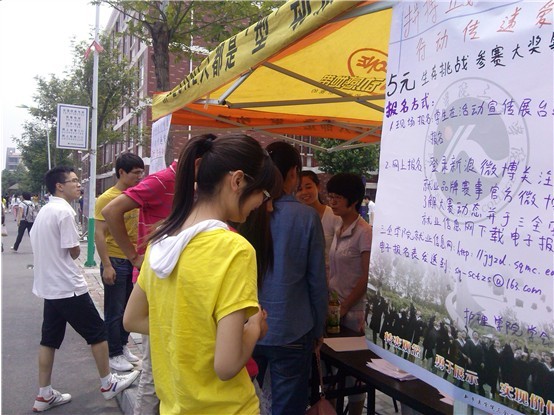 新颖刺激的比赛形式吸引了众多学生前往驻足观看并寻问相关流程,之后,大家纷纷现场填写报名表进行报名,也有部分学生选择通过新浪微博关注并发邮件网上报名。报名首日,已有一百余名学生报名参赛。参赛选手表示,本次大赛给自己提供了走向社会、展示自我的平台,能提前锻炼自己的职业能力和职业素养,十分期待自己在比赛中的表现。