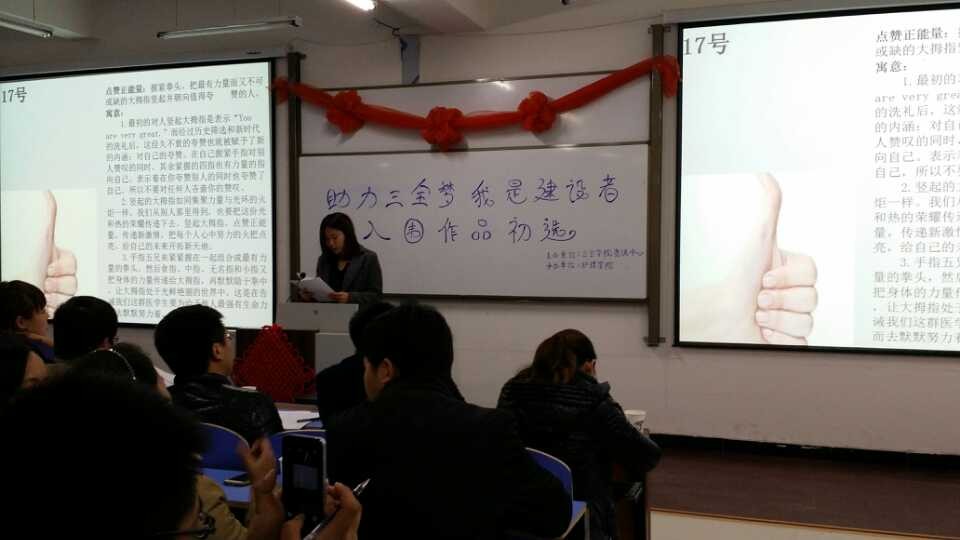为鼓励全院师生创意三全学院标志性手势,以手势展现心中正能量形态,传递正能量。11月26日下午3点,在第一教学楼B103教室,举办了由资讯中心主办,护理学院承办的“‘助力三全梦,我是建设者’系列活动之手势征集入围作品评选活动。本次活动特邀资讯中心陈宏主任、党办主任助理吕莎及各职能部门、各院系师生代表组成评委会,本着公平、公正、公开的原则对所征集的手势口号方案进行评选打分。护理学院党总支书记许红芝、副书记马素娟及全体辅导员出席本次活动。