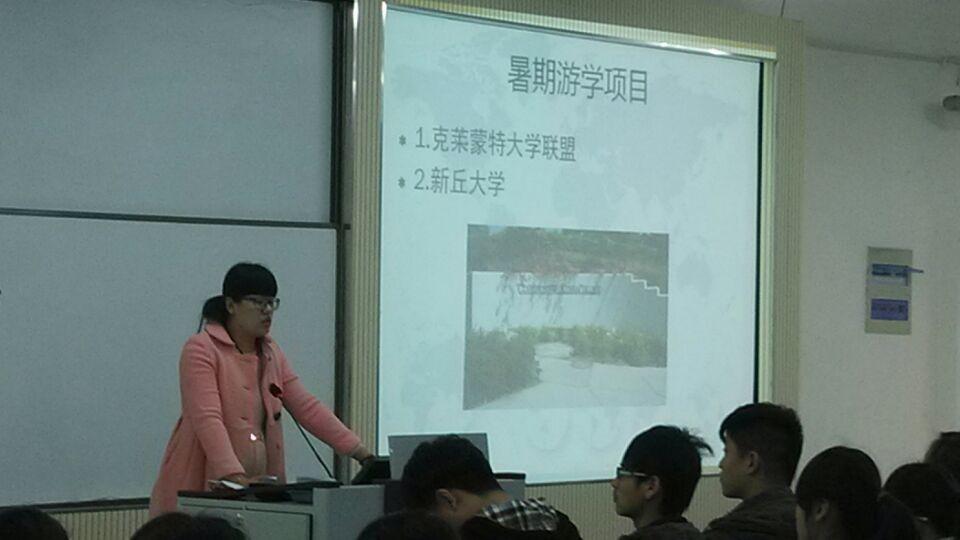 本次宣讲会内容主要为我院涉外留学、暑期赴韩赴美游学、赴台交换生等项目。会议伊始,张颖老师以2011年第一批赴台交换生关晓琳的台湾学习生活为例,为同学们讲解了学生对外交流的相关政策、流程、所用资费情况及暑期游学的相关内容。