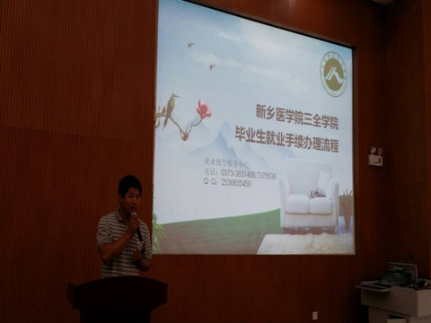 就业指导服务中心张帆老师风趣幽默的向大家讲解了实习过程中各种手续的办理流程以及手续办理的注意事项,使同学们印象深刻;教务部实践科张新富老师则从医学生为什么要实习讲起,着重介绍了实习的重要性及如何处理好考研与实习的关系;张颖老师详细介绍了有关实习的各项纪律及实习期间评优评先及护士职业资格证考试的时间安排,并强调了实习期间学生的安全问题。