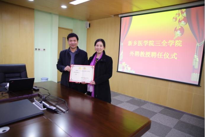 聘任仪式上,王彦杰院长致欢迎辞,他简要介绍了孙玉华教授的履历,并对孙教授正式成为护理学院一员表示热烈欢迎。随后,向孙玉华教授介绍了三全学院的发展情况以及向应用技术型大学转型的战略定位。他表示,期待护理学院能继续保持良好的发展态势,不断实现较大飞跃,加强品牌建设,突出专业建设,同时勉励护理学院教师努力提高学科研水平,创新能力,促进学院专业建设,提升人才培养水平和层次;护理学院院长薛松梅向孙玉华教授简要介绍了护理学院基本情况,代表全体教师对孙教授的加入表示热烈的欢迎,并期望护理学院的工作蒸蒸日上。