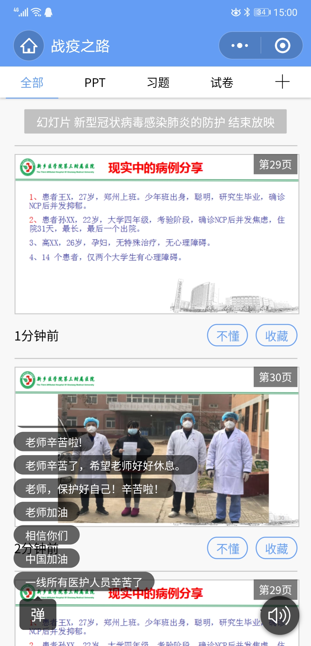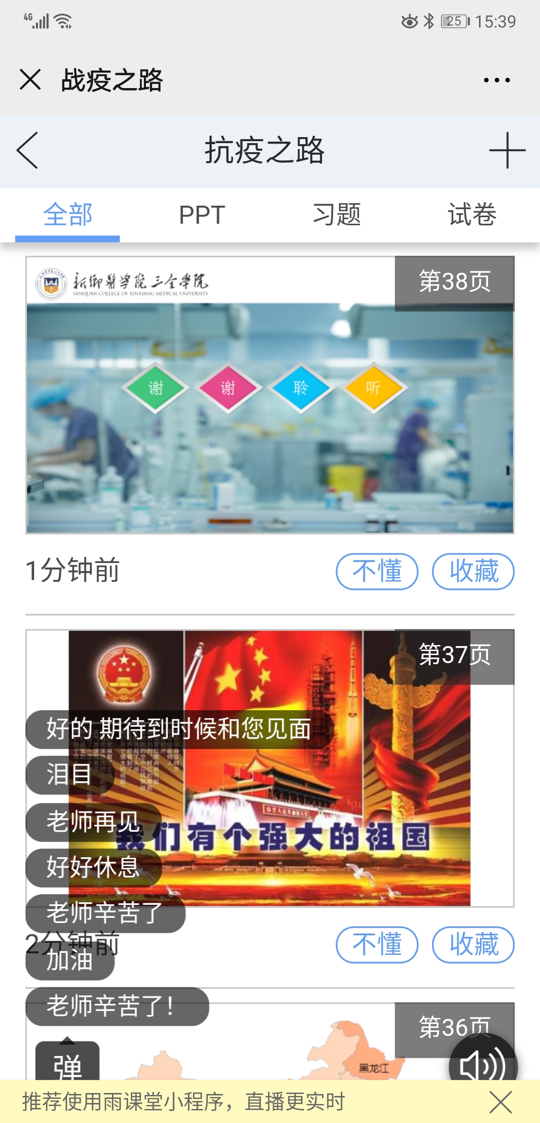 同学们边听边通过弹幕和老师互动,尤其是听到救治工作如此艰辛的时候,纷纷留言:老师,您平安归来;感谢祖国,让我们安全!