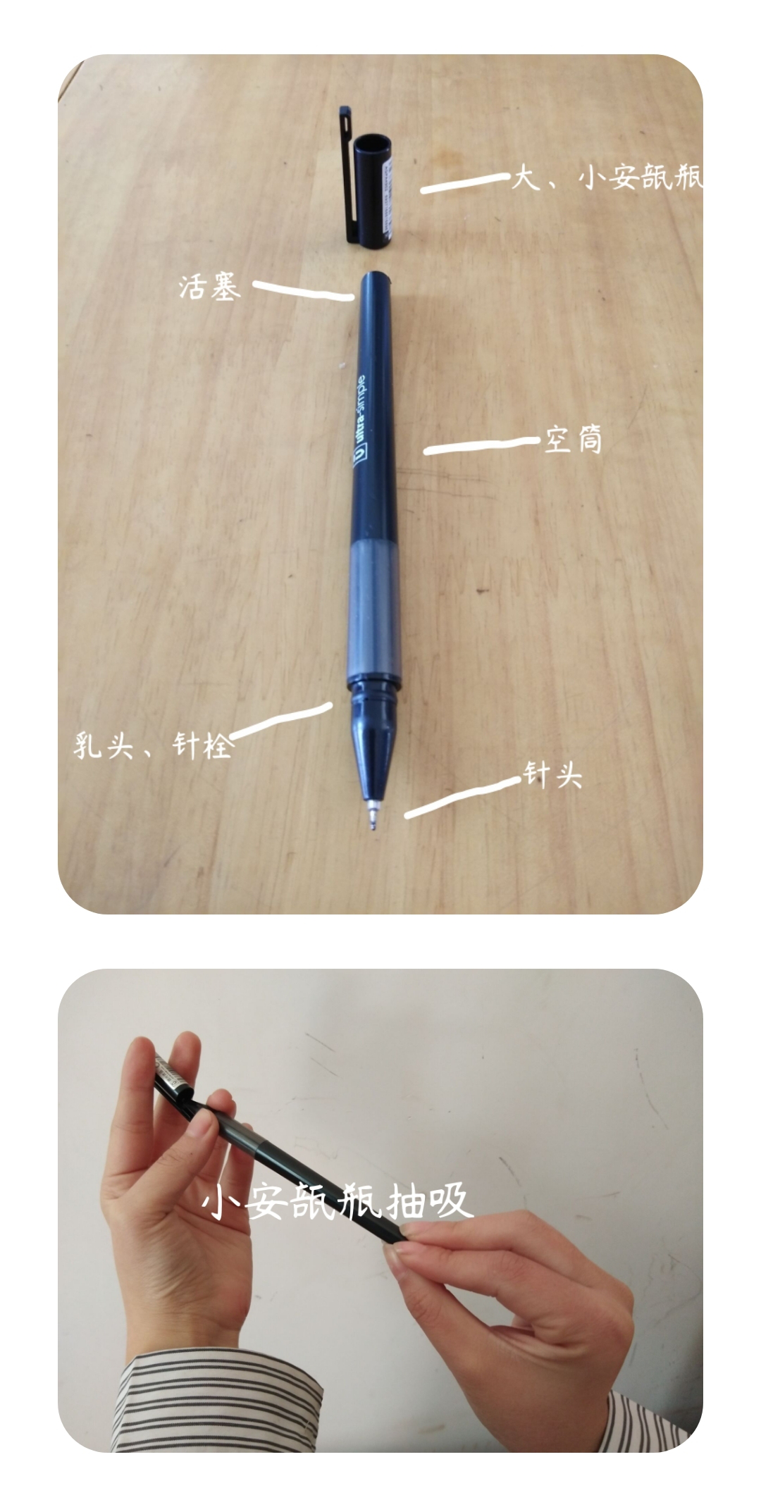 疫情之下出奇才。学生们面对这样的作业,经过短暂的迷茫,很快就有了妙招。同学们找来自动铅笔、水写笔、餐巾纸等来代替注射器、安瓿瓶,用橡皮筋代替止血带,创意十足,还有的学生真的找来注射器和安瓿瓶进行操作,学习热情相当的高。
