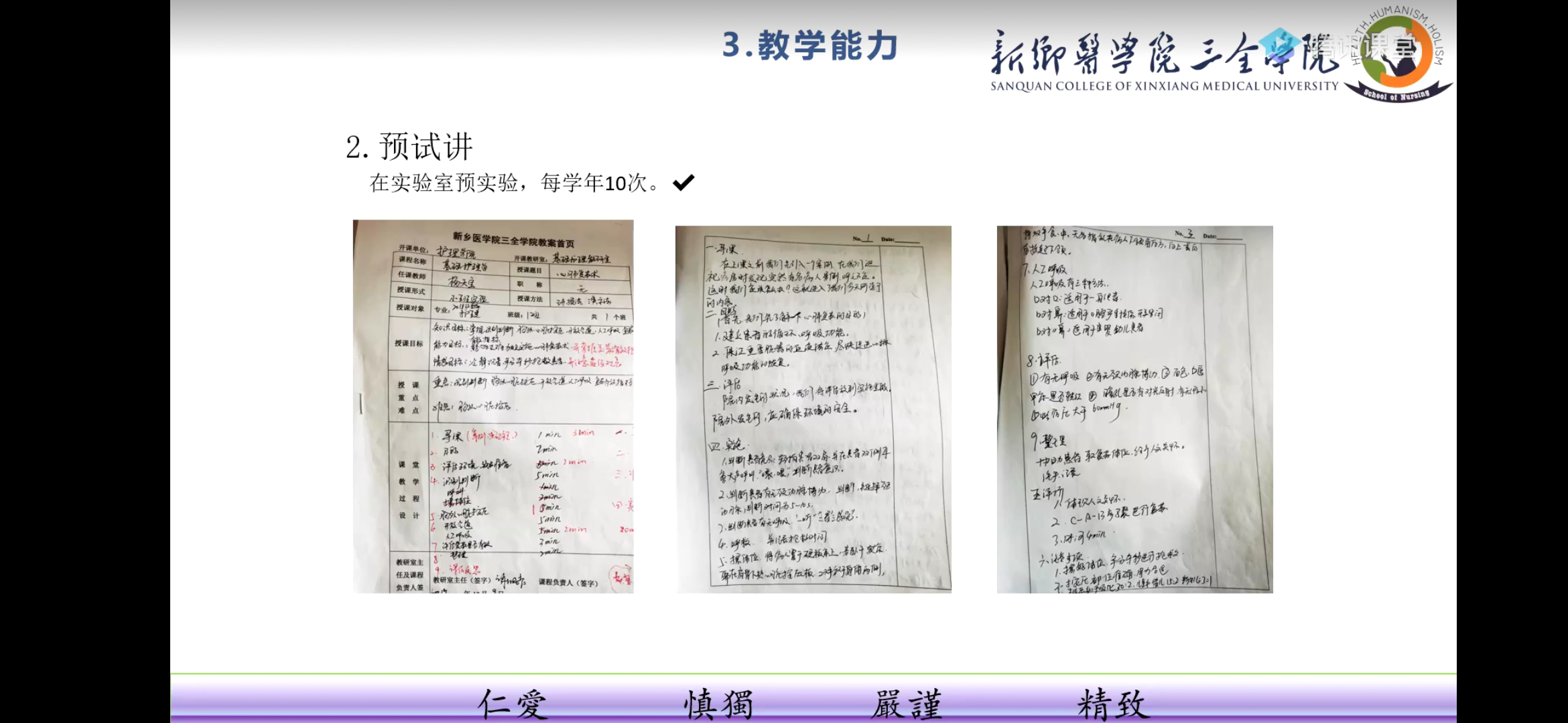 首先,按照青年教师考核标准,杨天宝等6位青年教师依次汇报本学年的工作业绩和心得体会。然后,教师发展中心的李东亮教授针对护理学院的青年教师培养工作给予指导。他提出,学校高度重视青年教师的培养工作,青年教师要注重教学能力的培养,不能局限于考核标准,要积极参与备课及教学研讨,多听课,多总结;护理学院要根据本专业特点,体现显示出青年教师培养中的特色和差异,要挖掘出高于考核标准规定的内涵和具体案例,实验技术人员的培养要根据实验准备特点自行制定标准,形成文字,利于执行。
