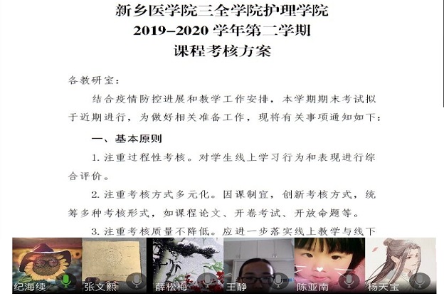 为规范线上考试,保障期末考核顺利进行,根据《新乡医学院三全学院关于做好2019-2020学年第二学期课程考核准备工作的通知》要求,6月15日9点半,护理学院在企业微信召开2019-2020学年第二学期考务会。护理学院全体教师参加。