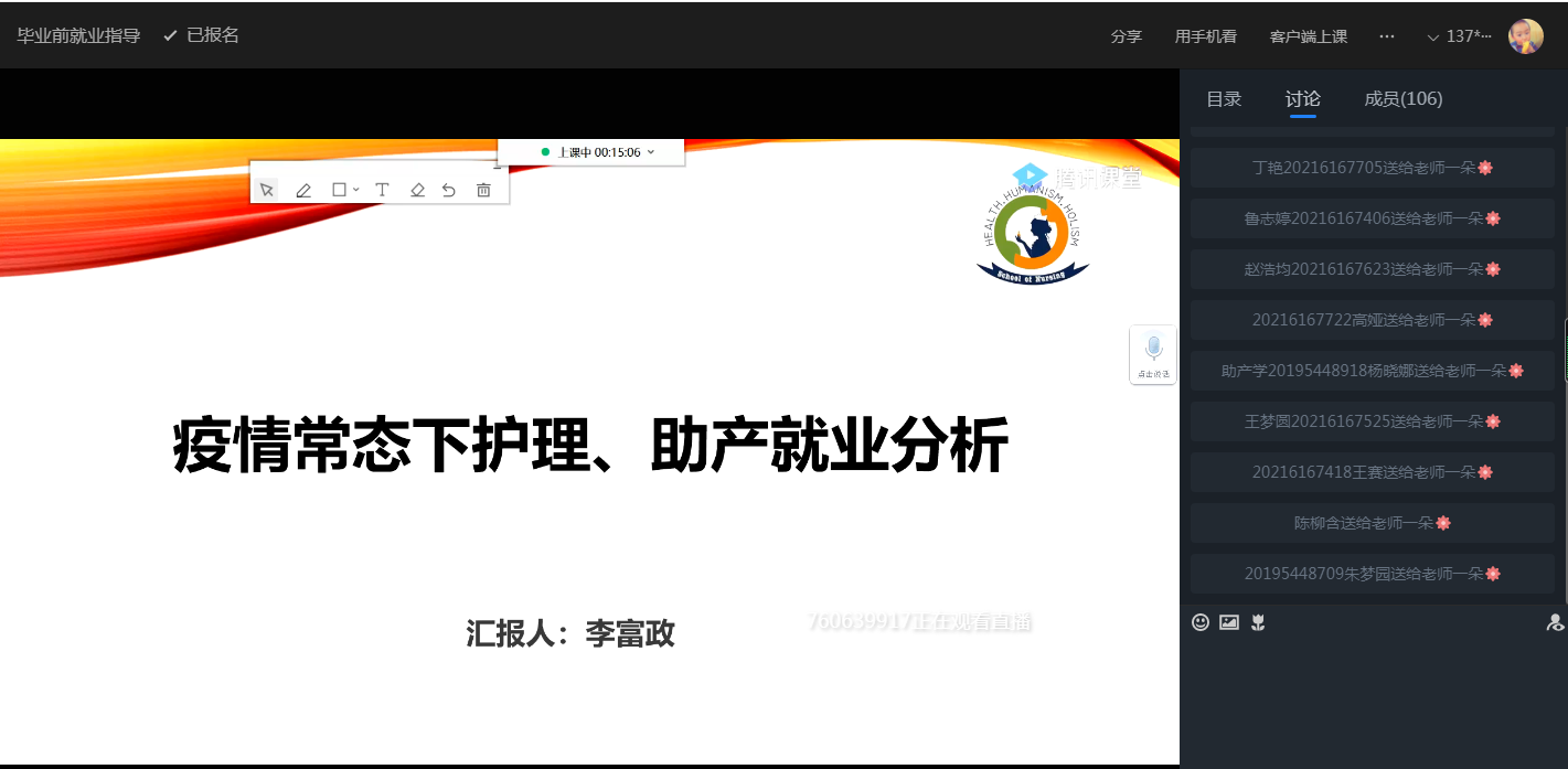 本次系列讲座还包含护士资格证考试指导、科学就业观指导,考研指导、毕业论文撰写指导等模块,并邀请考研上岸中南大学湘雅医学院护理专业的学姐,来自于郑州大学第一附属医院、新乡医学院第一附属医院、河南科技大学第一附属医院的优秀毕业生,他们均多次参加疫情防控工作,在自己的岗位上做出突出贡献,成为科室骨干,通过直播、录播等形式和实习生进行交流,打造立体化全方位的实习就业指导。