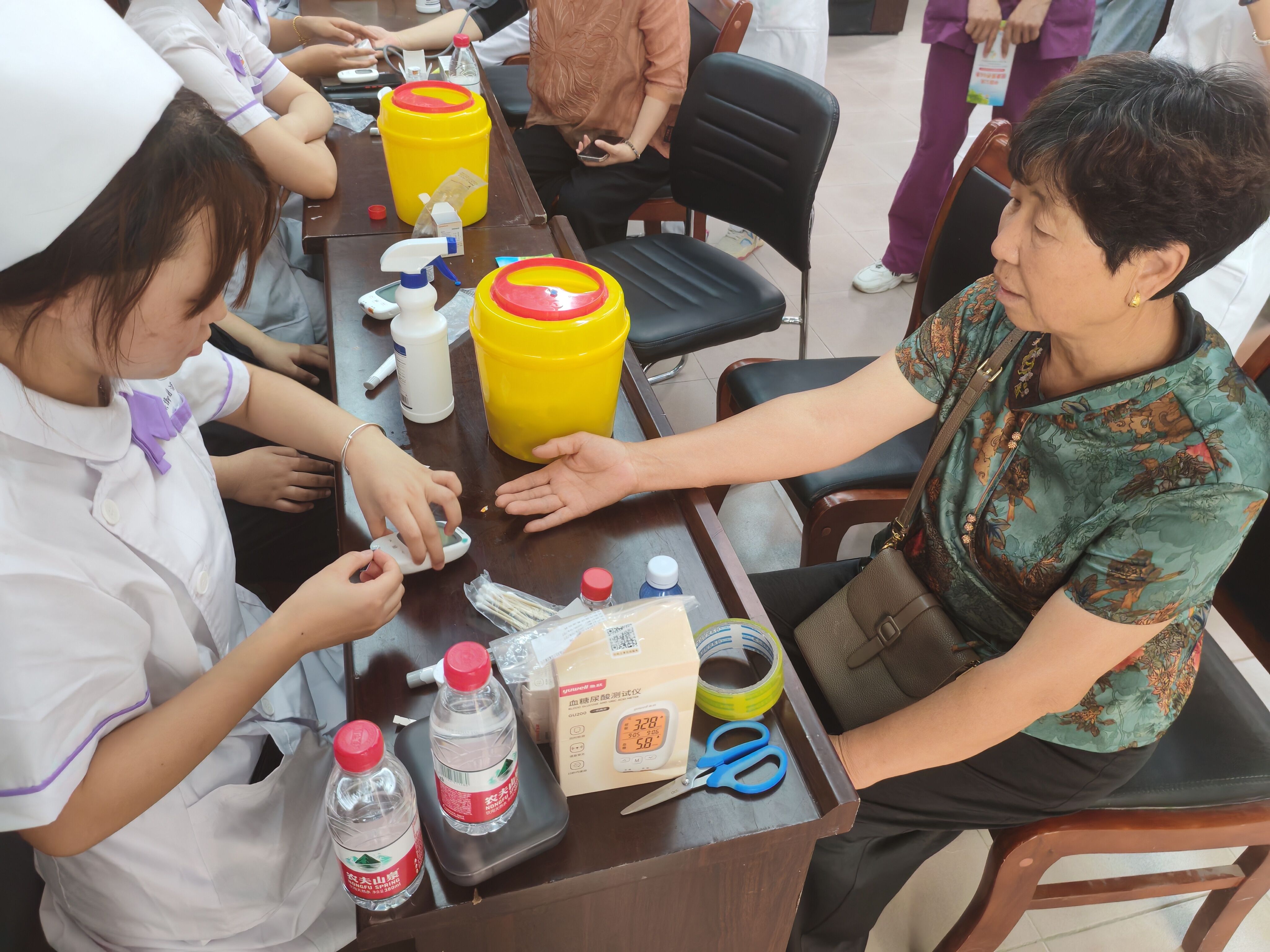 本次活动紧紧围绕《中国公民健康素养—基本知识与技能(2024年版)》的内容开展。在活动现场,我校南丁格尔志愿护理服务队借助宣传册向广大民众全方位宣传“健康素养66条”,包括“三减三健”(减盐、减油、减糖,健康口腔、健康体重、健康骨骼),健康饮食(增豆、加奶等)、心理健康、科学运动等健康知识,提升其健康素养水平。同时,设置了健康服务台,为群众提供体重指数、血压、血糖等多项健康指标的测量服务,并根据测量结果,为每位群众提供个性化的健康指导和建议。