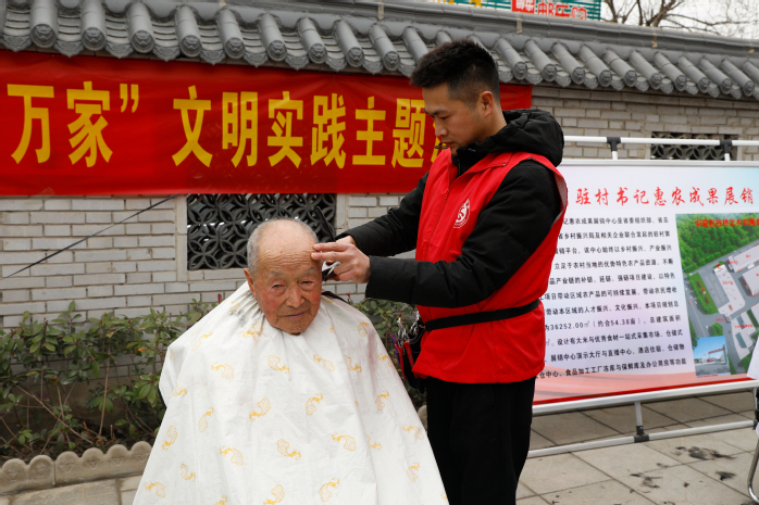 在理发摊位前,村民张厚发坐下来后,理发师就开始工作,他闭目养神,十分享受的样子,十几分钟后,理好的发型让他整个人都看上去精神多了。他摸摸头,笑着说:“每次文明市集,三全学院都会把他们学校美发店的老师带过来,他们的理出的发型可洋气了,我们村里人都喜欢让他们理!”