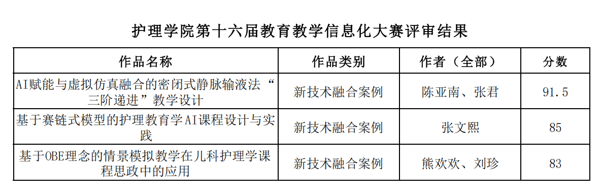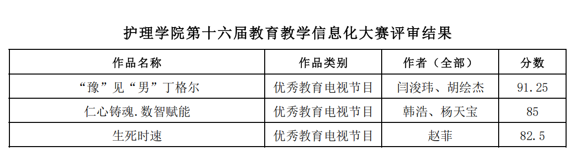 根据《豫北医学院护理学院第十六届教育教学信息化大赛方案》要求,经院系初赛,现将结果予以公示,公示期为3天。在此期间,如任何个人对评审结果有异议,请及时反馈至护理学院办公室。