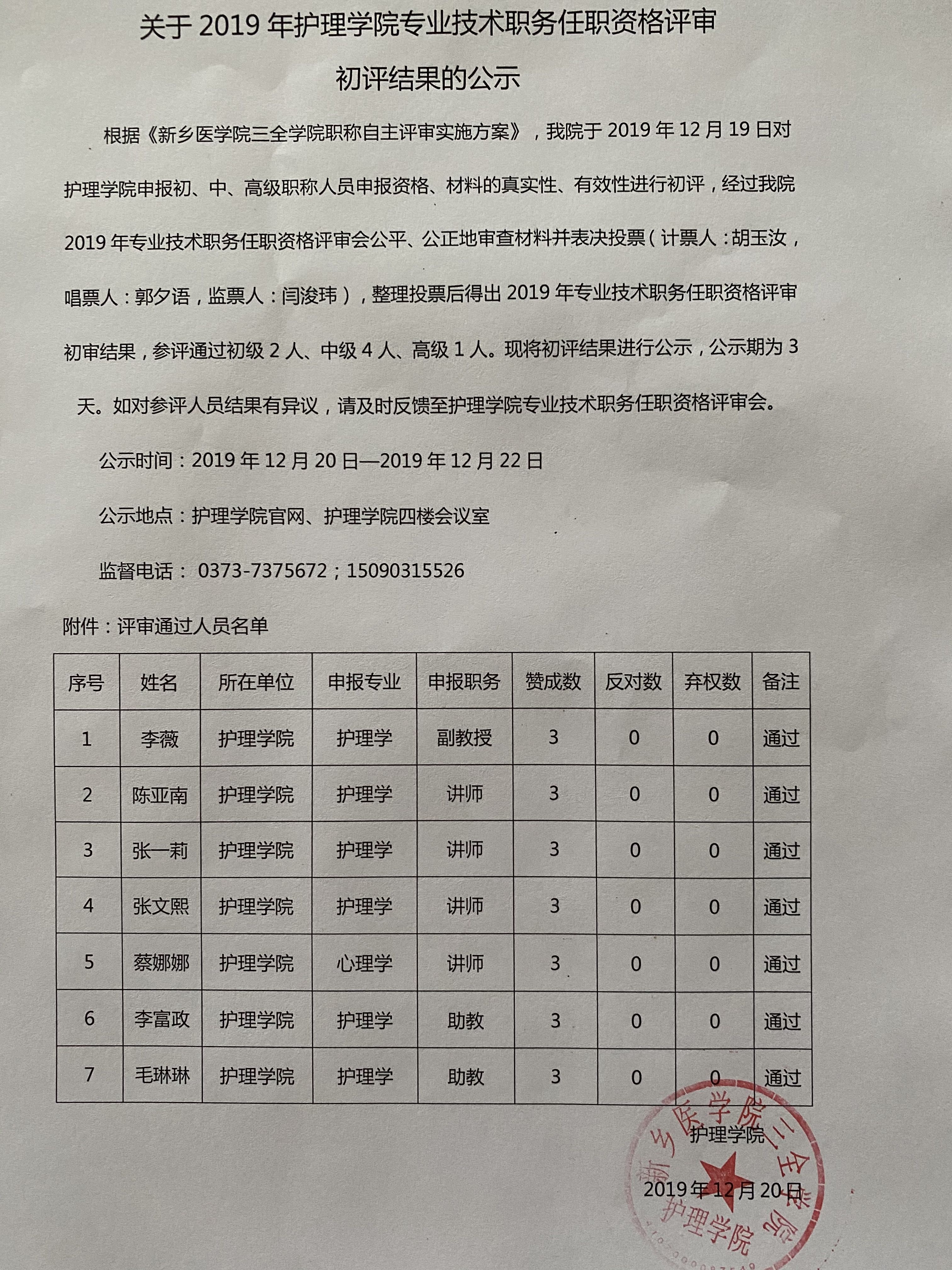 根据《新乡医学院三全学院职称自主评审实施方案》,我院于2019年12月19日对护理学院申报初、中、高级职称人员申报资格、材料的真实性、有效性进行初评,经过我院2019年专业技术职务任职资格评审会公平、公...