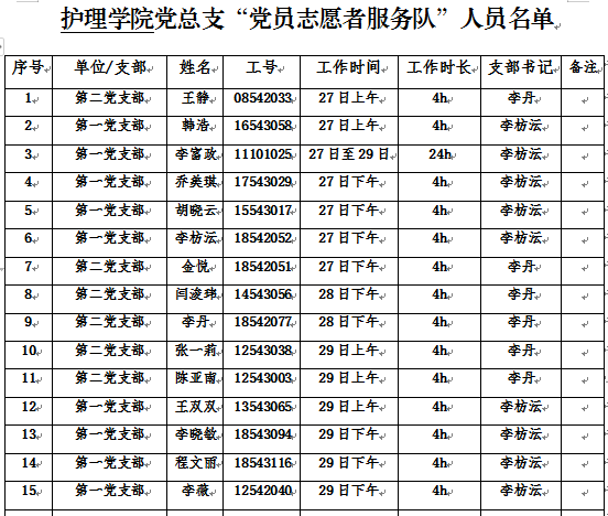 为充分发挥党支部战斗堡垒作用和党员先锋模范作用,更好地服务我校2019年迎新工作,护理学院开展“守初心担使命”师生党员迎新志愿服务,并成立护理学院党总支“党员志愿者服务队”,名单公布如下。如对以...