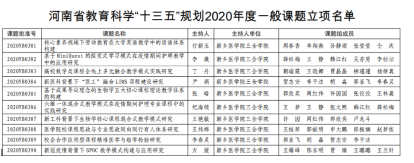 近日,河南省教育厅下发了《关于公布河南省教育科学“十三五”规划2020年度一般课题立项名单的通知》,我院李薇老师的《基于MiniQuest的探究式学习模式在疫情期间护理教学中的应用研究》和纪海续老师的《...