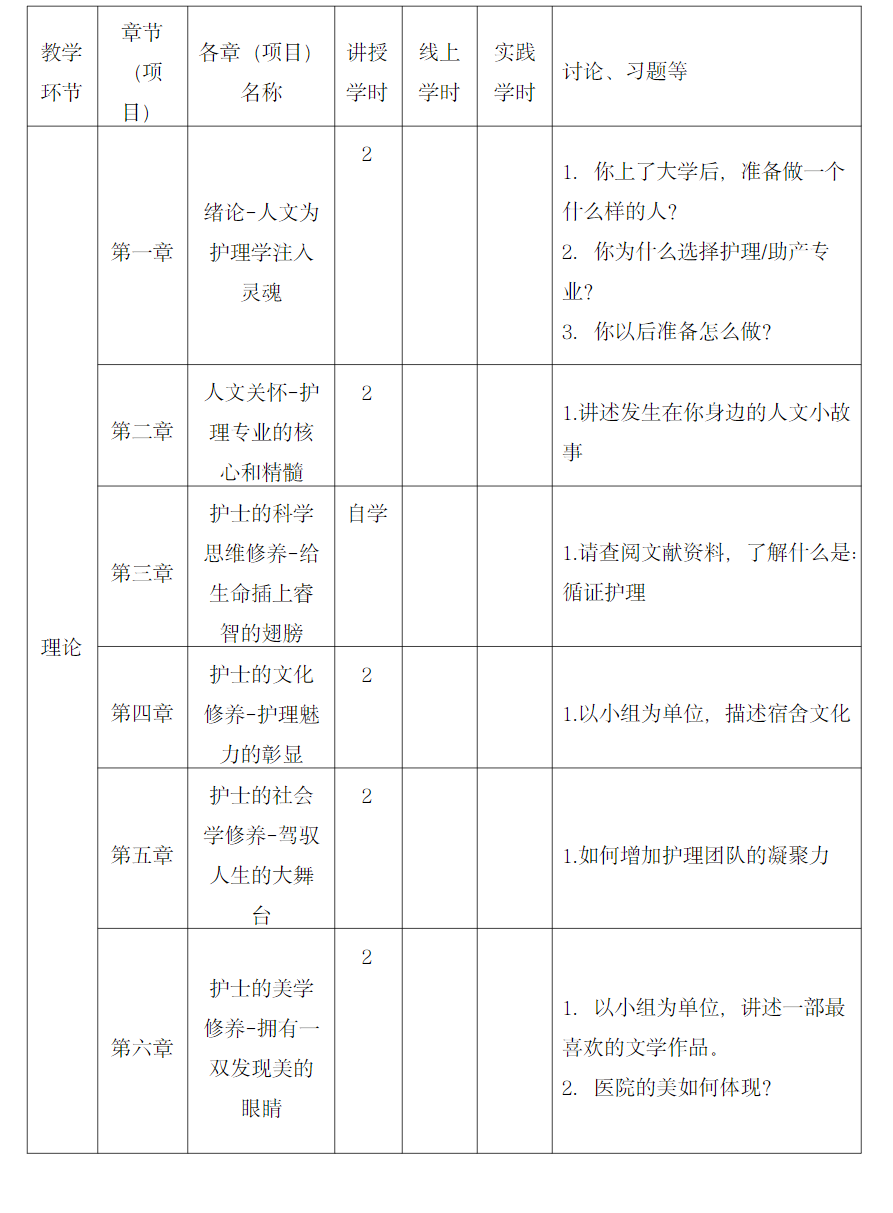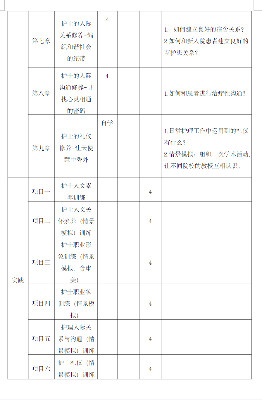 《护士人文修养》针对大一新生开设的一门专业必修课。本课程是以护士的岗位需求为基础,为加强护士人文素质而设置的综合性课程。将护理与人文相结合,对护士应具备的人文修养要素进行整合,使学生通过学习,了解人文科学的基本理论和人文修养的内容,熟悉护士应具有的人文修养以及提高护士人文修养的途径与方法,掌握人文科学在护理工作中的应用方法,培养学生 “以人为本”的整体护理观,提高文化品味和审美情趣,培养良好的人际沟通能力,社会适应能力、批判性思维能力等,自觉将人文关怀融入到护理实践中。